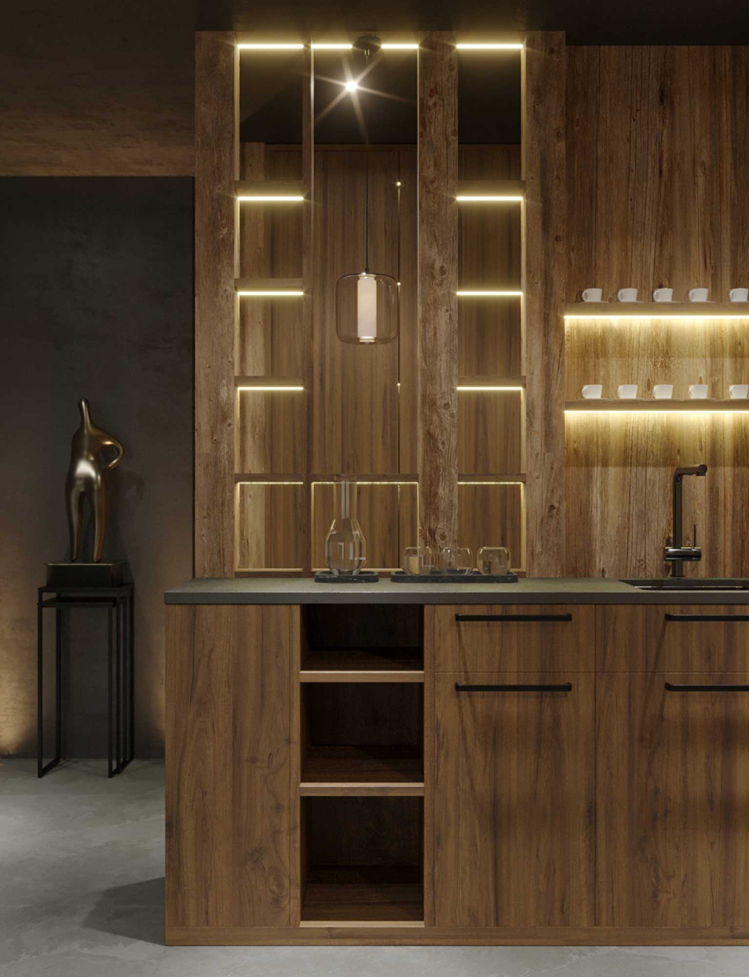 Refined alpine living distilled into an intimate space. Floor-to-ceiling windows frame the Lotschental Valley in every season.
